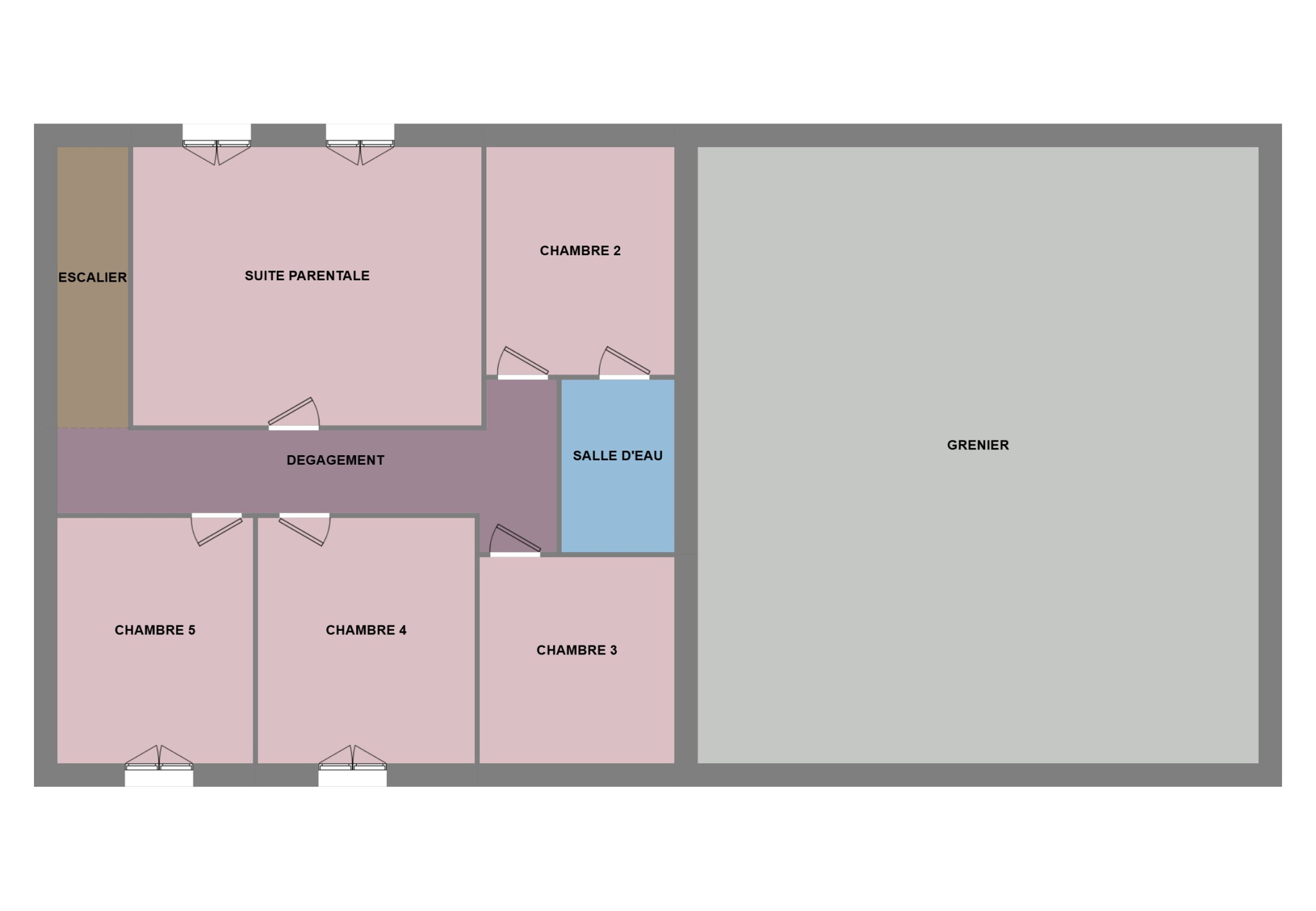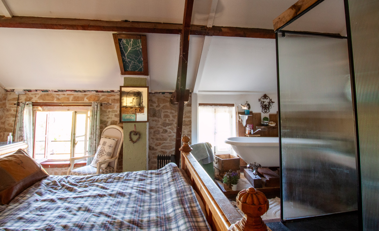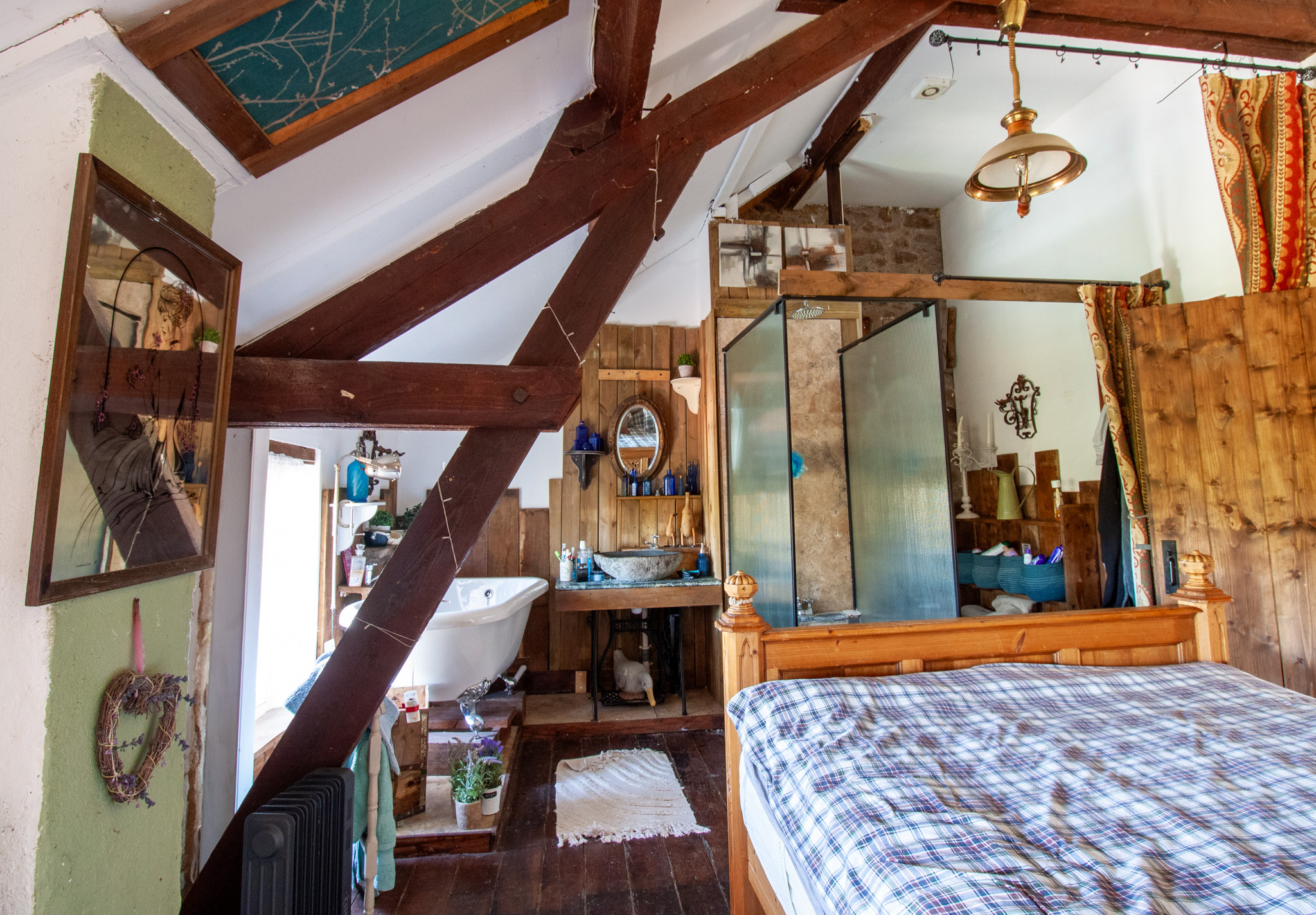 Étage : une suite parentale mansardée avec douche et baignoire sur pieds "pattes de lion", quatre autres chambres lumineuses, ainsi qu’une salle d’eau supplémentaire.